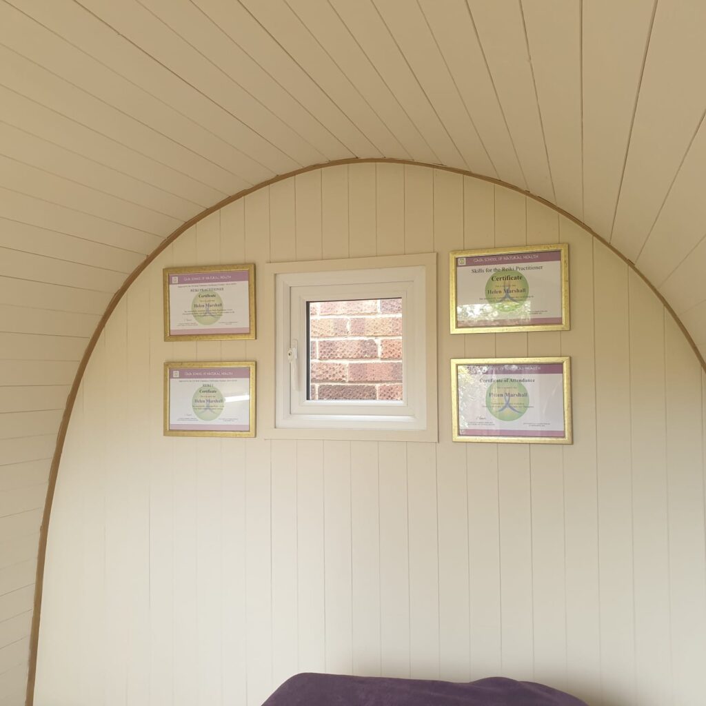 Helens certificates are proudly displayed inside the Reiki Hut.